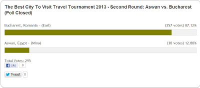 Acum suntem în runda ”Elite 8”. Au mai rămas în competiție doar 8 din cele 64 de orașe. Și printre acestea, spre bucuria noastră, două sunt din România. Runda a început, se poate vota aici până pe 20 martie 2013 ora 6 pm US Est (joi 21 martie ora 0:00 – ora României). Cele 8 orașe rămase în concurs sunt: Granada (Spania), Lisabona (Portugalia), Edinburg (Scoția) și București (România) pe de o parte, respectiv Casablanca (Maroc), Buenos Aires (Argentina), Dublin (Irlanda) și Sibiu (România) pe de altă parte. De remarcat că 6 orașe sunt din Europa, unul din Africa și unul din America de Sud. Orașele noastre sunt astfel poziționate încât o posibilă confruntare între ele ar fi posibilă doar în finală.