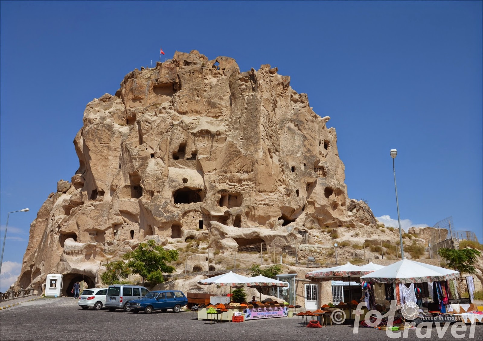 Uçhisar pare desprins dintr-o altă lume. Întreg orășelul pare a se confunda cu muntele pe care este construit. La prima vedere casele par sărăcăcioase, te mir din ce trăiesc oamenii aici. Însă valurile de turiști ce vin să vadă de la înălțime Cappadocia sunt sursa de venit a localnicilor. Aproape toți trăiesc din turism și din comerț. Ca de obicei, aici se vinde și se cumpără orice. De la mici magazine de bijuterii, la souvenir-uri sau antichități. Autocarul ne lasă în ceea ce pare a fi piața centrală a orașului. Cei care n-au zburat dimineața cu balonul merg să urce la cetate pentru a vedea și ei de la înălțime zona. Castelul Uçhisar este cel mai înalt punct terestru al Cappadociei. E un colț de stâncă din același material moale de tuf vulcanic, în care omul a scobit diverse încăperi legate între ele printr-un labirint de străduțe, tuneluri sau scări. Un bilet de intrare care-ți asigură accesul în cetate costă 6 lire (9 lei). Cei mai mulți din grupul nostru de turiști aleg să urce pe munte.