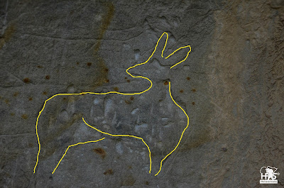 Ignor urmele ”civilizațiilor” recente și mă concentrez pe urmele vechi. Sunt multe animale. Sălbatice, cu siguranță, după modul în care a ales ”artistul” să le reprezinte. Să fie vulpe sau poate lup? Să fie căprioară? Iarăși e greu de precizat, depinde ce vrei să vezi.