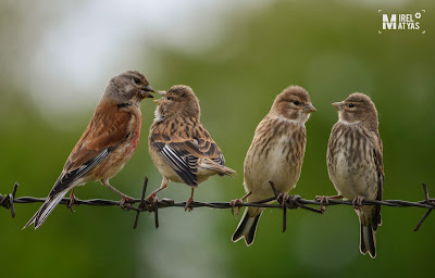 Sunt gata să renunț, când, în partea opusă, pe dreapta, pe un gard văd alte păsări. Le iau în vizor prin parbriz, realizez că nu sunt vrăbii dar parcă nici cinteze. Risc și cobor încet, cu intenția să ajung în dreptul lor. Pe măsură ce mă apropii, realizez că e un adult care-și hrănește puii. De fapt sunt juvenili, măricei, dar încă dependenți de hrana adusă de părinți. Sunt trei juvenili înșirați pe sârma ghimpată de deasupra gardului. Adultul părea preocupat să hrănească juvenilul din stânga, în timp ce ceilalți așteptau cuminți să le vină rândul.